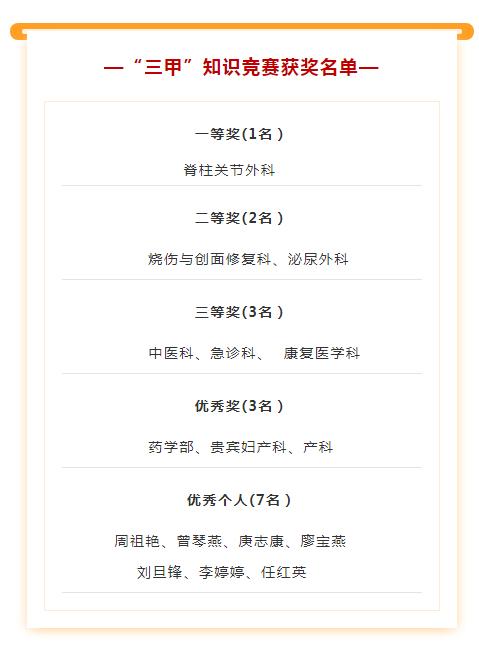 由三甲办组织的三甲应知应会知识竞赛活动,吸引了医院众多科室的积极参与,经过初赛和复赛的紧张角逐,参赛者凭着平时打下的扎实功底,你追我赶,各显神通,最终取得了优异成绩(获奖名单附后)。